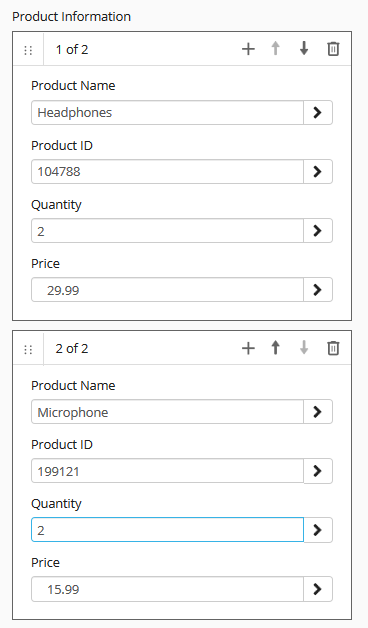 Multi-value fields may also be combined into groups. When multi-value fields are collected into a multi-value field group, the first value for each field will be displayed together, and then the second value for each field will be displayed together, and so on. If a name has been specified for a multi-value field group, that name will be listed above all of the groups.