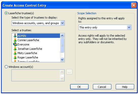In the Create Access Control Entry dialog box, an administrator can configure rights for a user, group, or Windows or LDAP account on a previously selected document or folder. Administrators can also select how the set of rights will affect the contents of a folder (e.g., subfolders and documents).