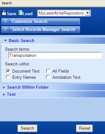 Basic or click Reset at the bottom of the Search Pane.Note: After performing a document or annotation text search, you will notice that the Contents Pane (displayed to the right of the search pane) will be split in half. The top half will display a list of documents containing the word "Transportation" , along with a count of occurrences. The bottom half will contain a list of occurrences for the currently selected document, along with a line of context and the page number on which it occurs.